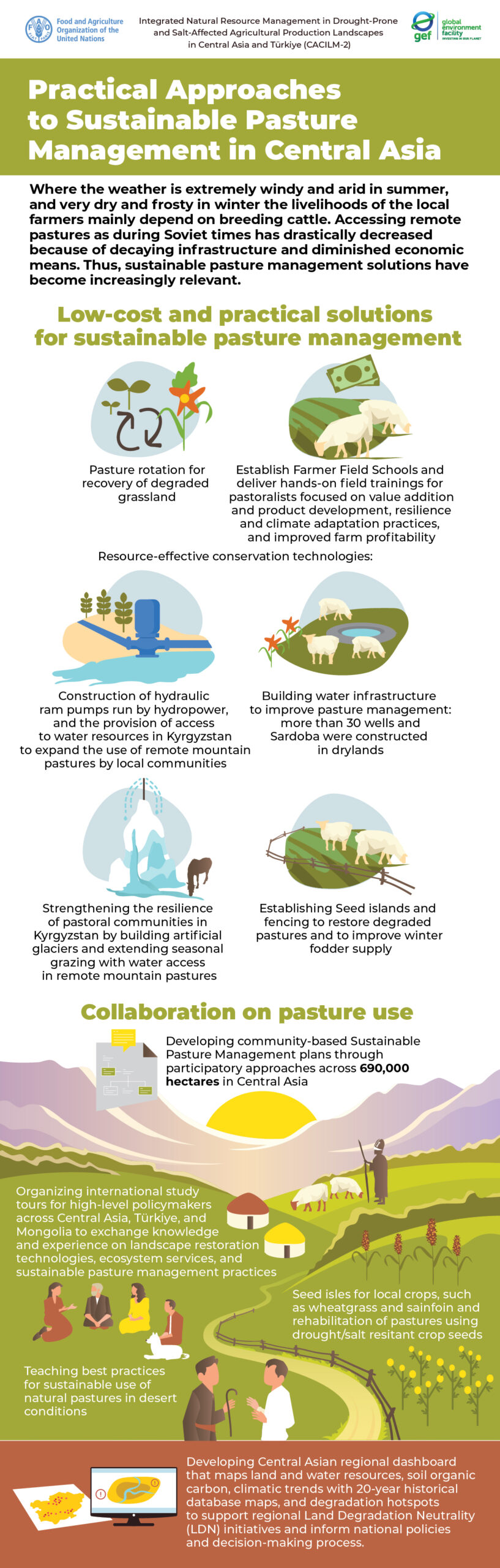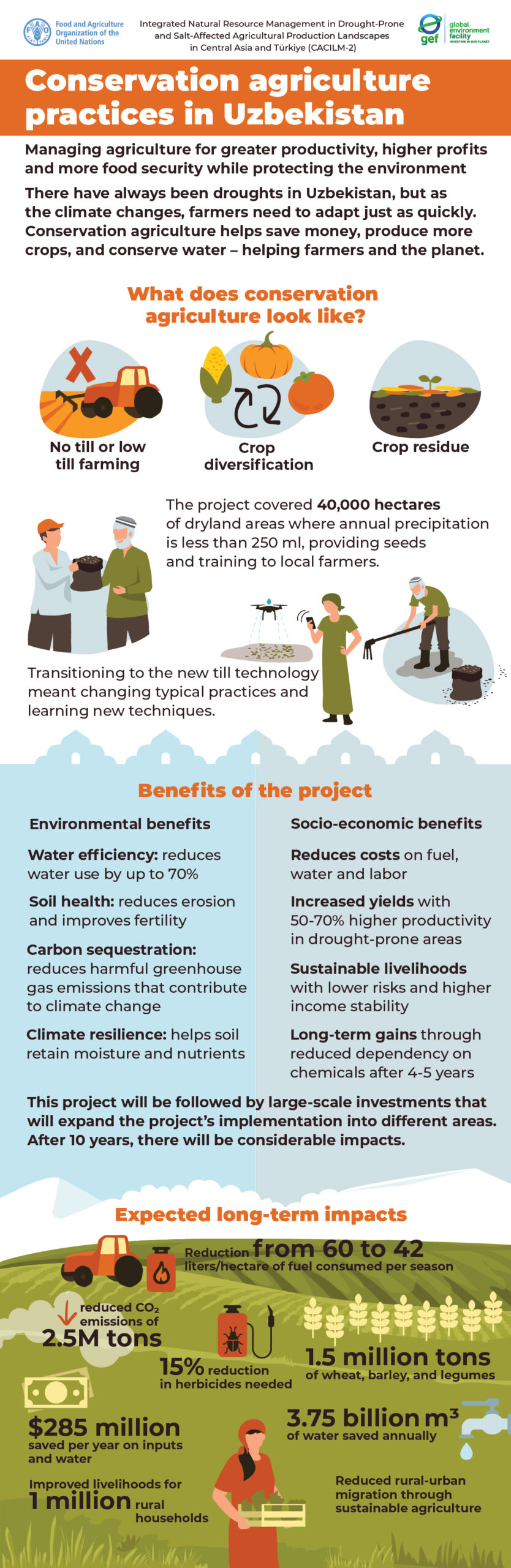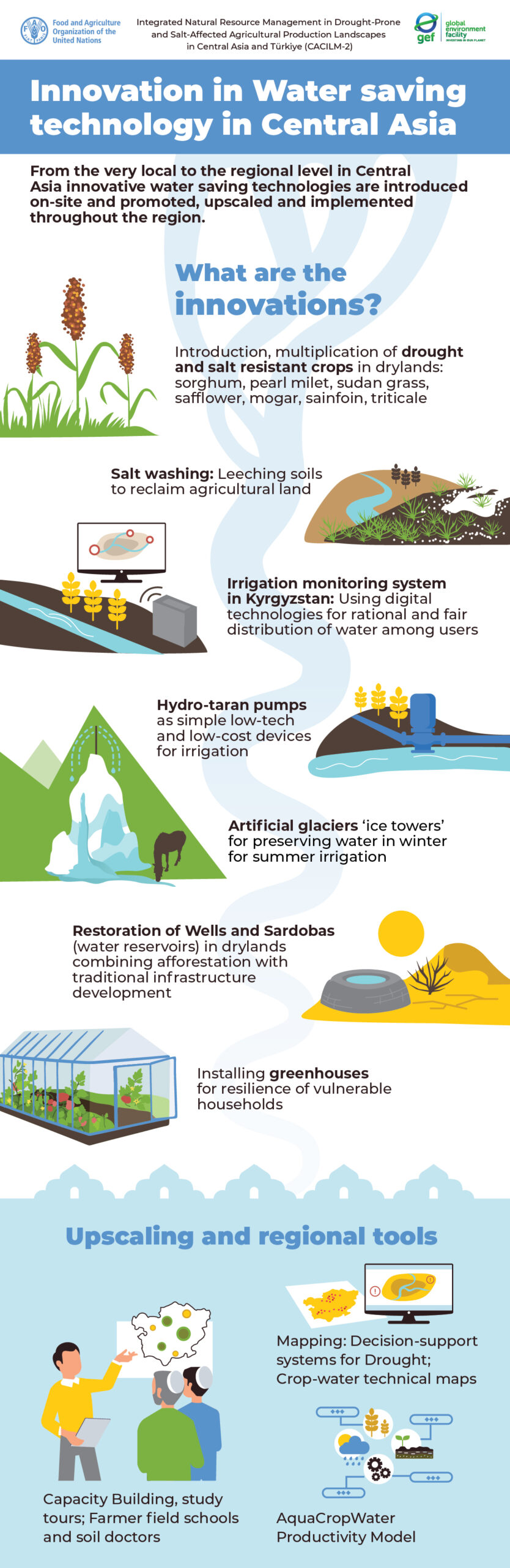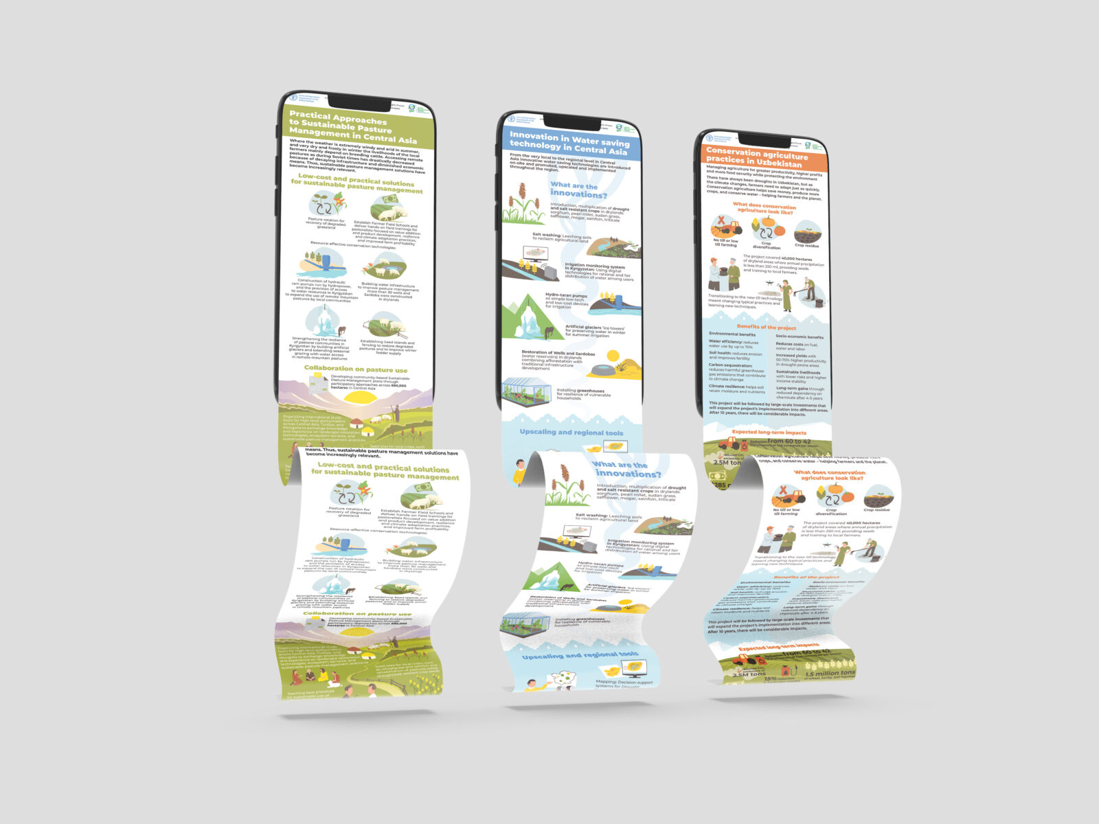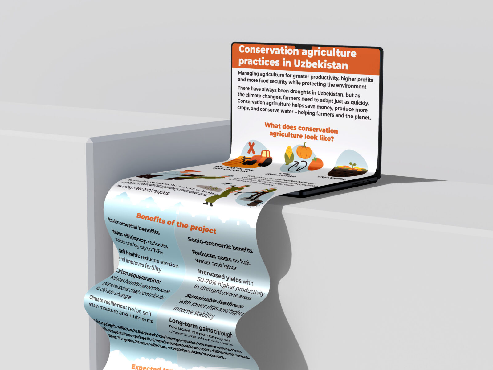 Droughts and salination threaten agricultural production systems in Central Asia and Türkiye. These infographic scrolls promote the use of traditional and innovative solutions in developing best practices for conservation agriculture, sustainable pasture management, and water-saving technologies.